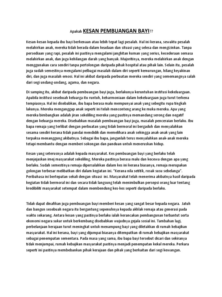 Pengertian pembuangan bayi adalah bayi yang di buang oleh pasangan yang melakukan zina dan mengandung anak luar nikah. Kasus semacam ini punya dimensi penyebab yang berlapis. Dikejar tuisyen sana, tuisyen sini. Naratif utamanya sering kali menyalahkan wanita yang terpaksa memilih jalan tersebut sebagai penyelasaian kepada kehamilan tak dikehendaki. 0 ratings0% found this document useful (0 votes).